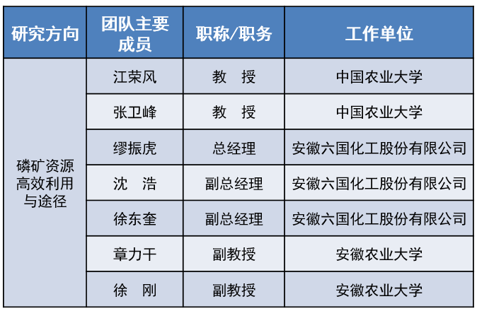 该方向主要开展磷矿资源高效选采、加工以及磷矿废弃物资源化综合利用的研究。重点开展对中低品位、低品位的磷矿的开发利用研究,优化并完善磷矿加工处理流程;改进湿法磷酸工艺、改变原料配矿比,用低品位、中低品位磷矿生产高质量的磷酸,开发新型化工产品;针对磷矿开发利用过程中产生的大量固体废弃物(如废石、重选固体废弃物、浮选固体废弃物和磷石膏等),研究和探索其资源化利用的方法与途径,逐步消耗存量,有效减少增量。团队主要研究骨干如下: