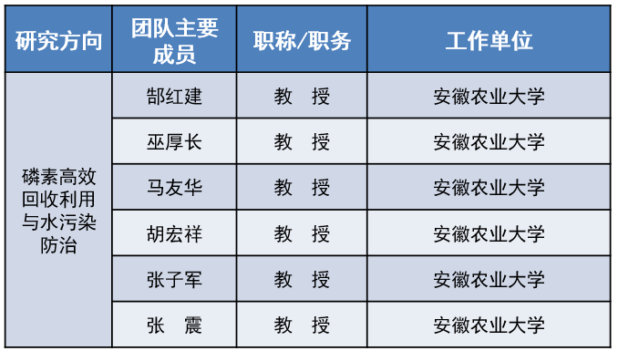 该方向主要开展农业废弃物磷素回收与利用、农田磷素流失过程与阻控和水体磷素污染防治等关键技术研究。研究开发低成本生态净化工艺,实现农田径流中磷素的高效低耗去除及资源化利用;运用生物、化学与生态等技术,实现农业废弃物(主要是废水)中营养元素的高效回收与利用;开发新型高效磷素回收绿色产品,结合长江经济带不同地区的地理及气候特点,开发低成本生态净化技术,进行污水中氮磷元素的深度处理,提高土地对废水的承载量。团队主要研究骨干如下: