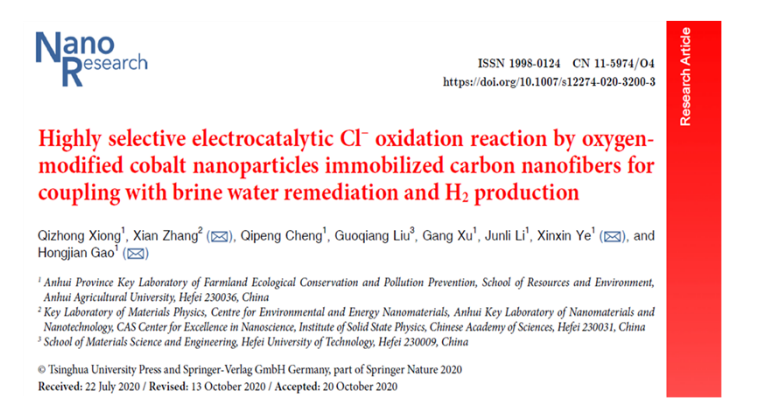 研究团队近期在高水平期刊Nano Research(中科院一区,IF =8.183)在线发表了题为“Highly selective electrocatalytic Cl−oxidation reaction by oxygen-modified cobalt nanoparticles immobilized carbon nanofibers for coupling with brine water remediation and H2production”研究论文。本研究构建高选择性钴纳米颗粒镶嵌的碳纤维析氯催化剂用于电催化海水裂解,为清洁氢能源的规模化生产提供了有效的策略。熊启中博士作为第一作者,中国科学院固体物理研究所张显以及安徽农业大学叶新新、郜红建教授为该文的共同通讯作者,安徽农业大学为第一单位。论文链接:https://doi.org/10.1007/s12274-020-3200-3。